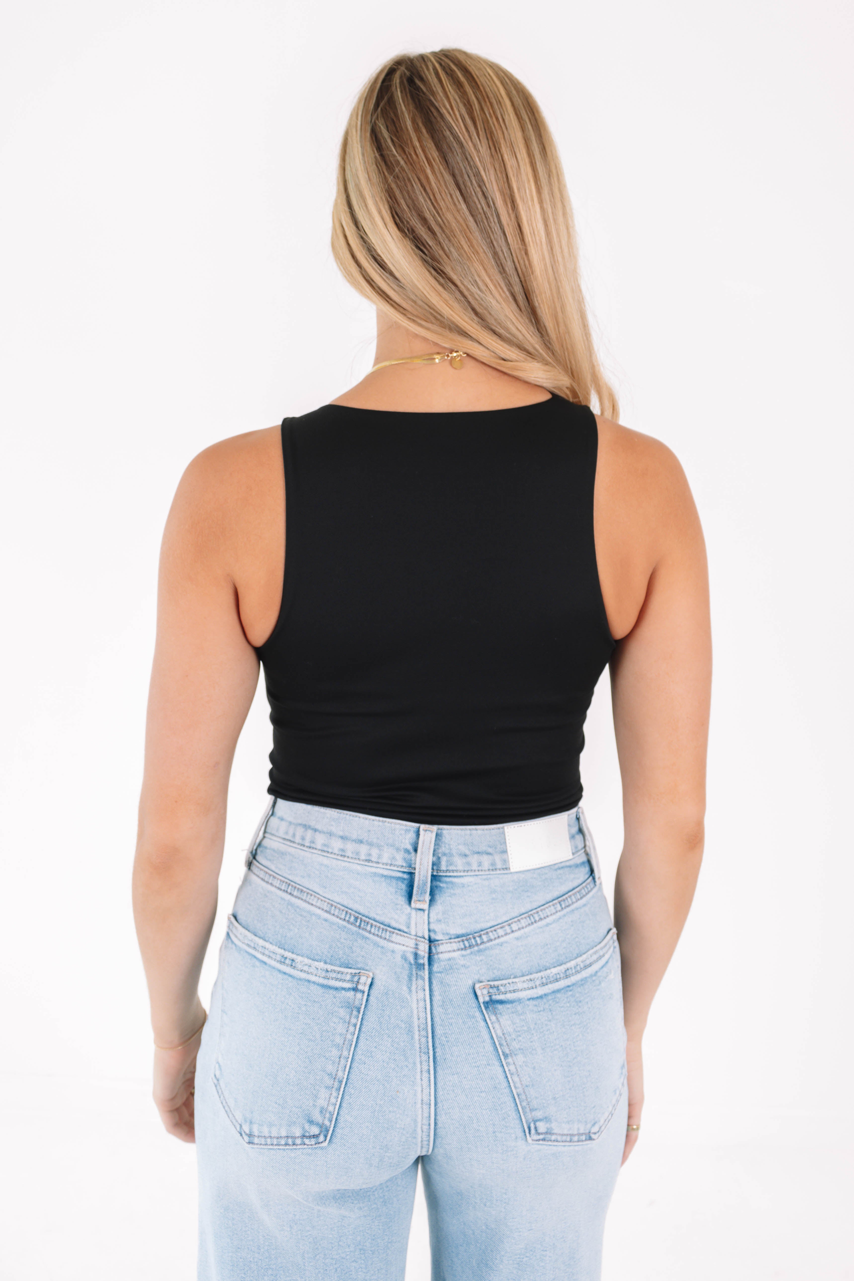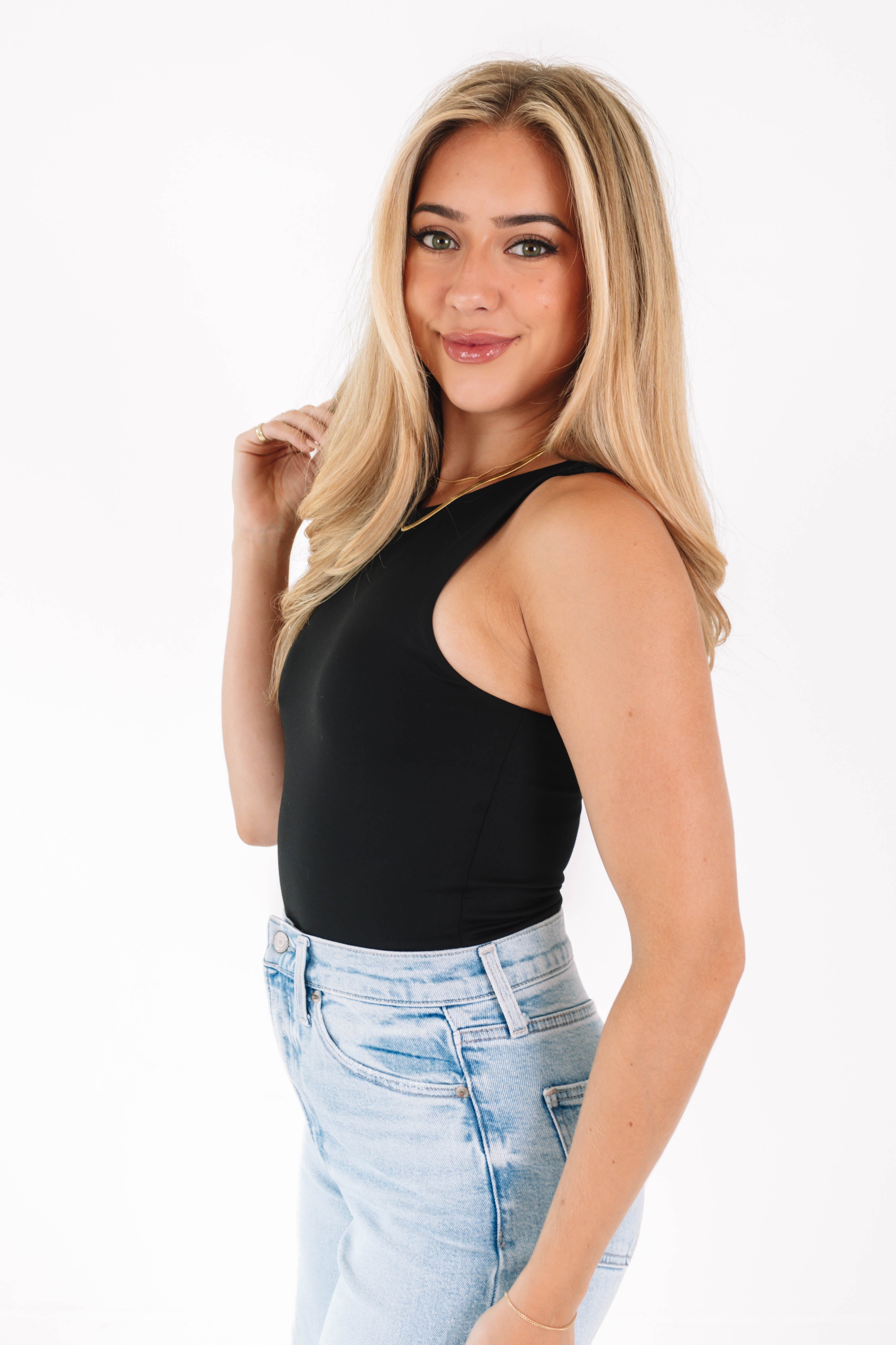 Create a sleek and simple look with this buttery soft bodysuit. The high neckline and tank top fit are the perfect basic, and the double lined material creates a sleek and modern look. Pair with any bottoms and some accessories to find your new favorite outfit!