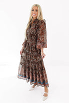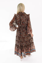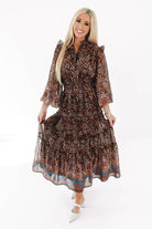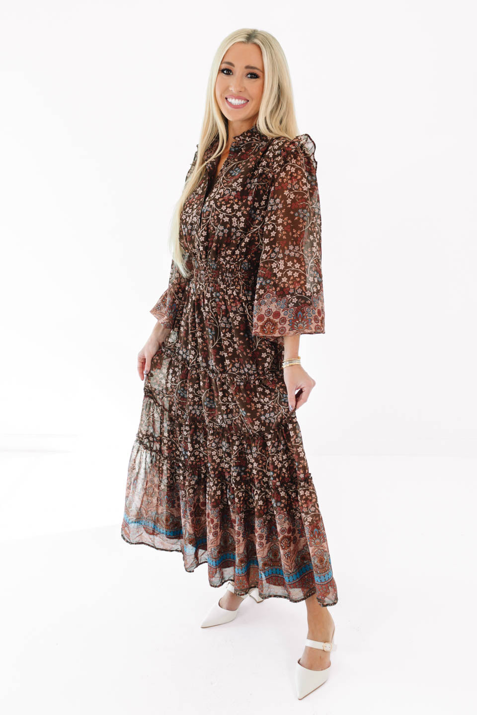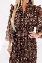 This dress brings vintage charm to life with its rich brown tones and delicate floral print. The flowy skirt and high neckline make it the perfect mix of cozy and elegant. Add boots or heels, and you’re ready to twirl through fall in timeless style!