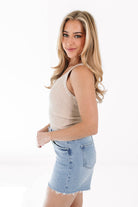 This tan ribbed tank with embroidered trim is your new go-to for sunny days and laid-back vibes. Perfect for a picnic in the park or a weekend getaway, it looks amazing with denim shorts and sneakers. Throw on some dainty layered necklaces and oversized sunnies for a touch of casual chic!