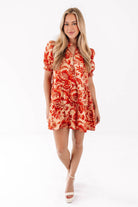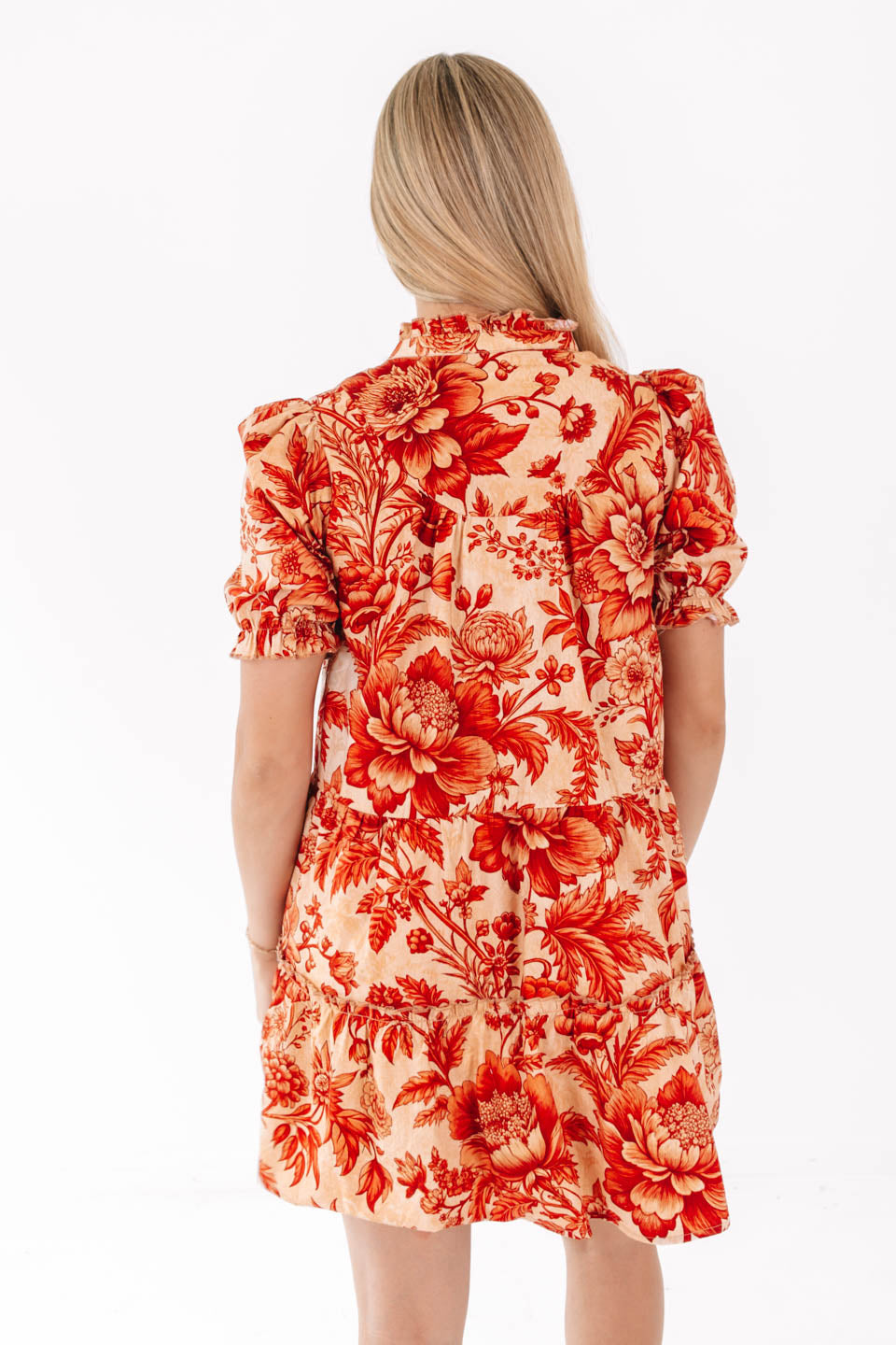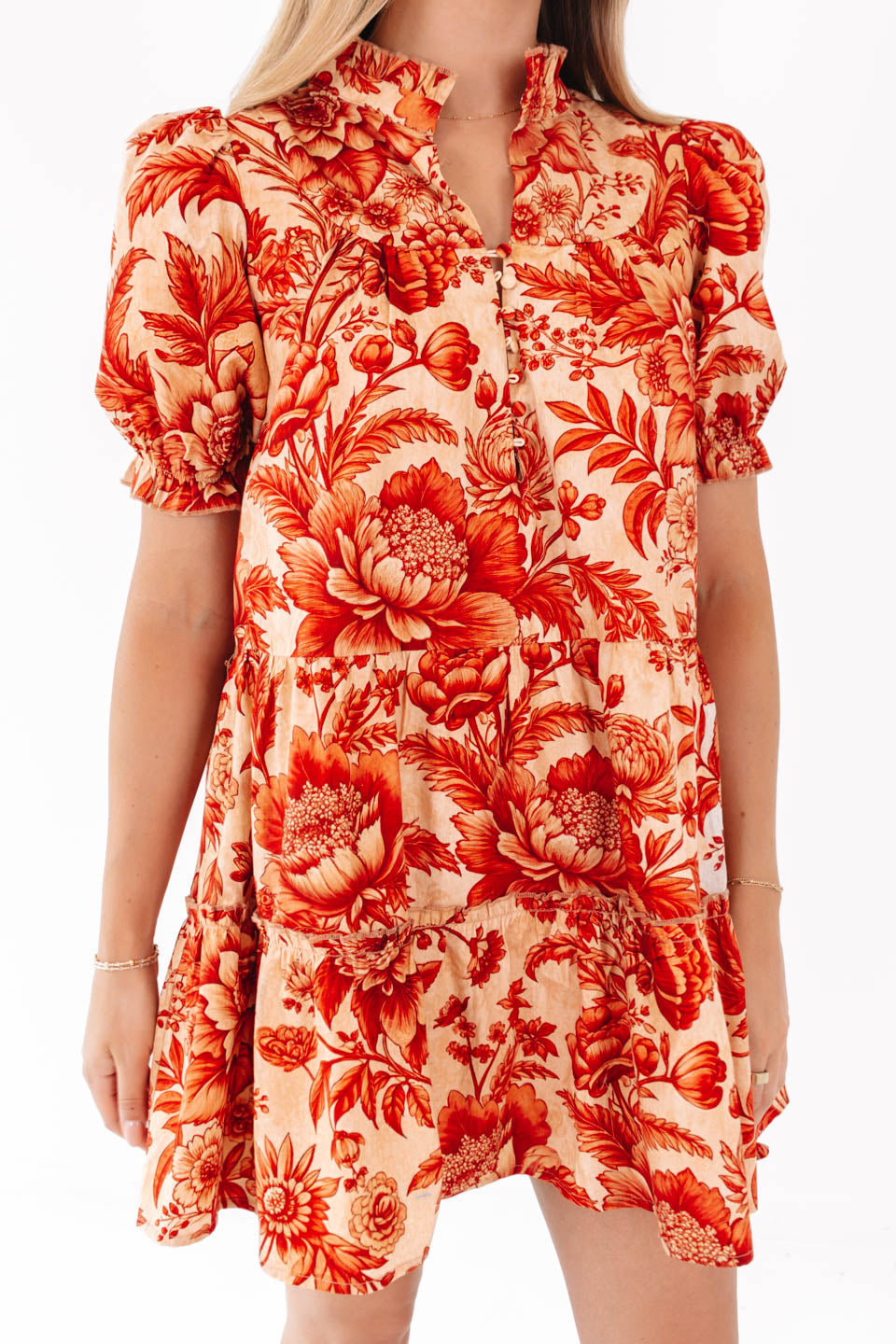 This dress is a bold floral dream, bursting with rich terracotta blooms that instantly brighten the room. The tiered silhouette and puff sleeves give it a playful, twirl-worthy vibe that’s equal parts effortless and chic. Perfect for brunches, strolls, or just soaking up compliments all day long!