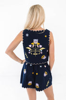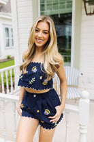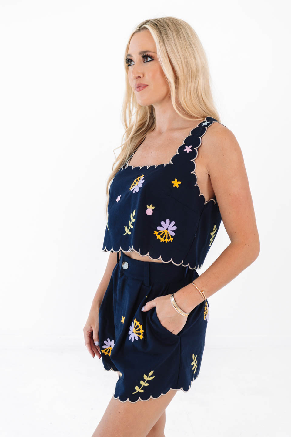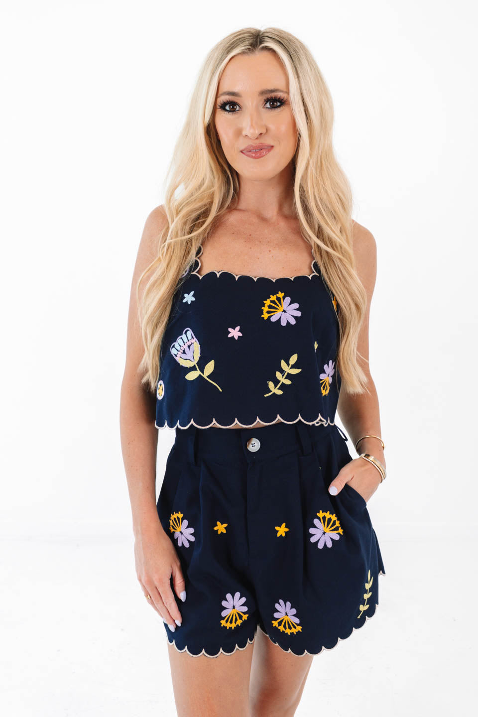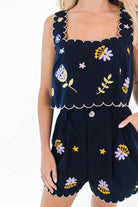 This playful embroidered top is serving garden-party glam with a side of sunshine! The scalloped edges and cheerful floral details make it feel like summer in every stitch. Pair it with matching shorts or denim cutoffs and you’re officially the cutest bloom in the room!