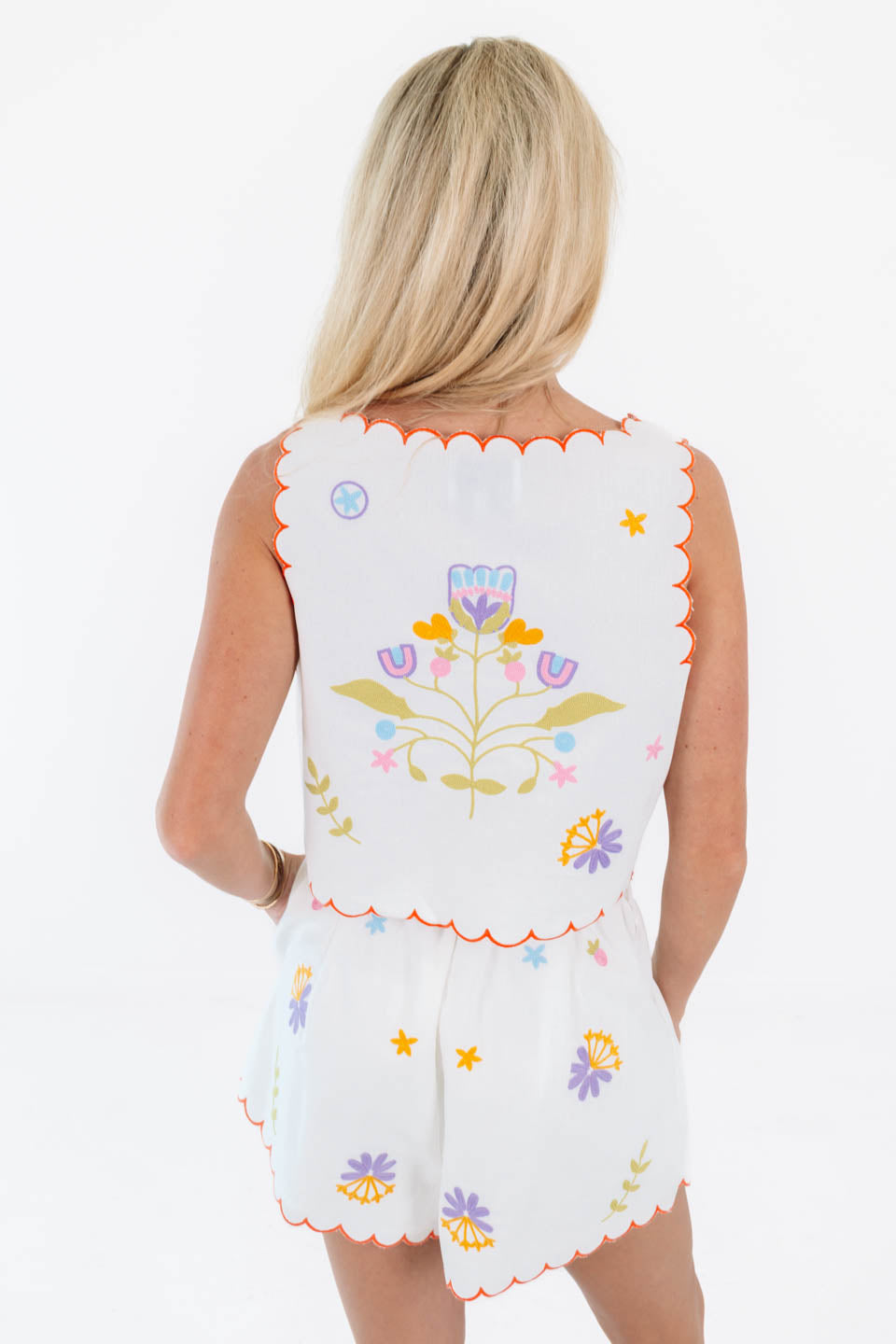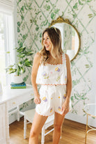 This playful embroidered top is serving garden-party glam with a side of sunshine! The scalloped edges and cheerful floral details make it feel like summer in every stitch. Pair it with matching shorts or denim cutoffs and you’re officially the cutest bloom in the room!