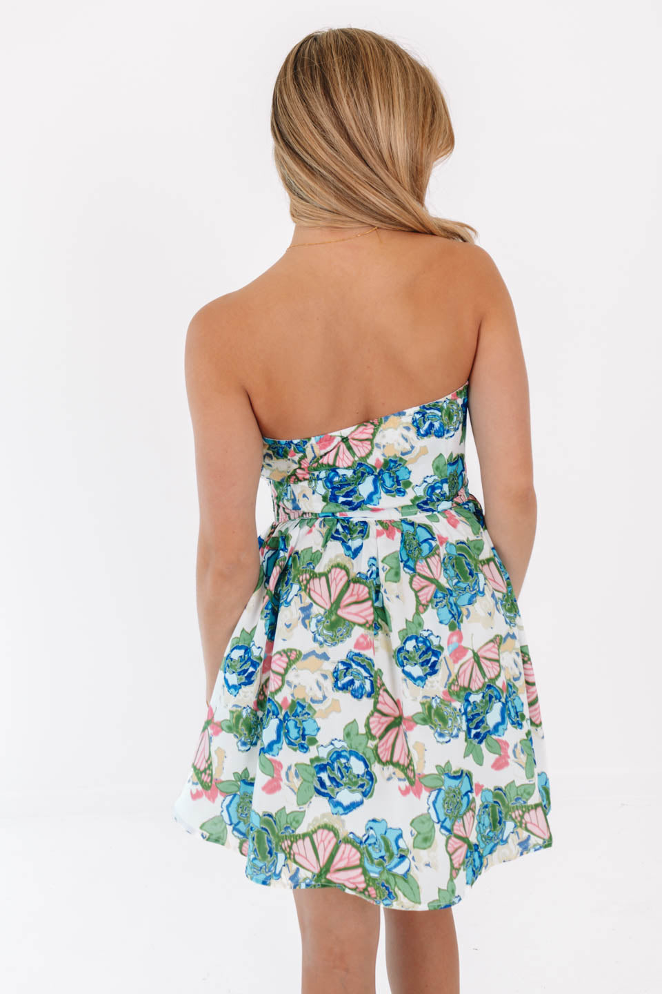 Fun, flirty, and bursting with color, this strapless mini dress is the ultimate statement piece for sunny adventures! Whether you're twirling at a summer festival, sipping cocktails at a rooftop bar, or heading out for a beachside dinner, this bold floral-and-butterfly print will turn heads. Style it with gold earrings, sandals, and a cute crossbody for a playful, effortlessly chic vibe!