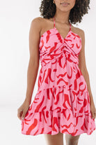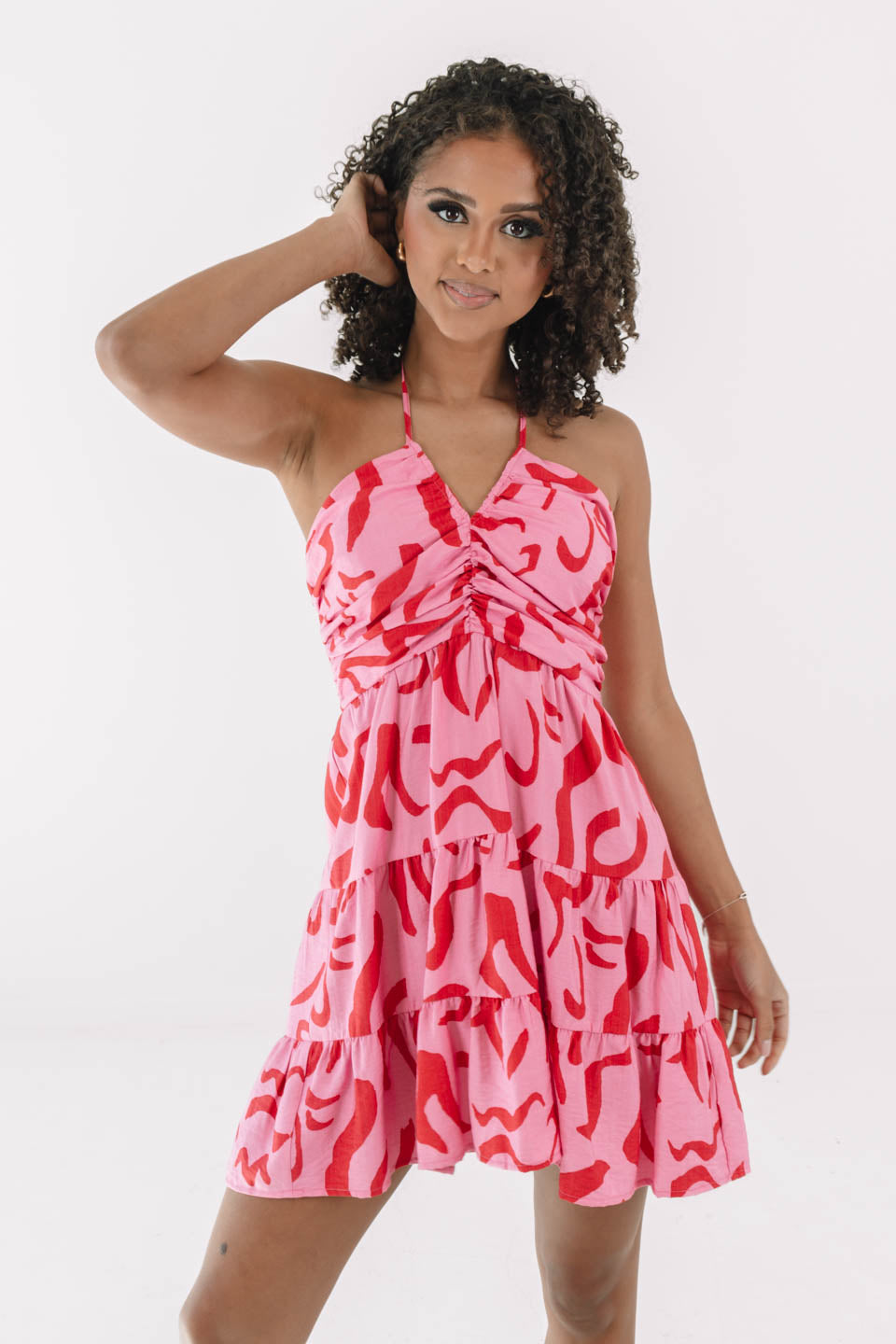 Turn heads and steal hearts in this flirty halter mini dress bursting with bold pink and red swirls! With its ruched bodice and tiered skirt, it's giving major vacay vibes and spontaneous brunch energy. Just add sunshine, a smile, and your favorite sandals for the ultimate fun-day fit!
