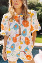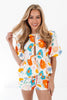 This top is a sunshine-filled dream, bursting with watercolor florals in happy hues of orange, blue, and yellow! The playful puff sleeves and tie-front details add a breezy, effortless charm that’s perfect for poolside lounging or summer brunches. Paired with matching shorts, it’s a head-to-toe look that screams vacation vibes and carefree fun!