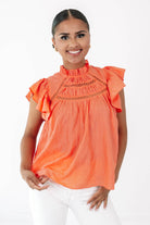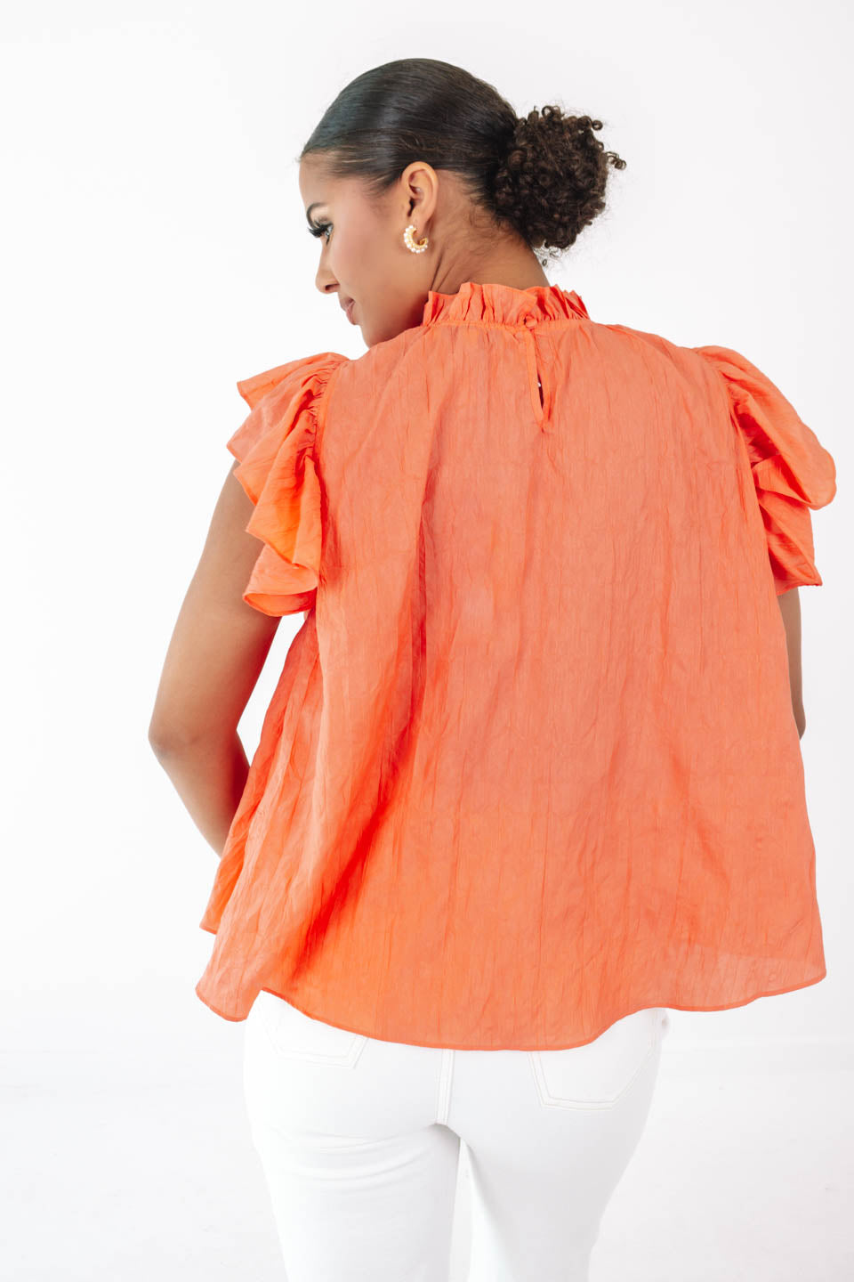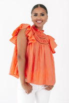 Bursting with vibrant orange hues, this playful top is a sunny day essential that radiates cheerfulness. The flirty ruffled sleeves and intricate lace details add a touch of boho chic, making it perfect for carefree adventures. Pair it with your favorite white jeans for a look that’s as refreshing as a summer breeze!