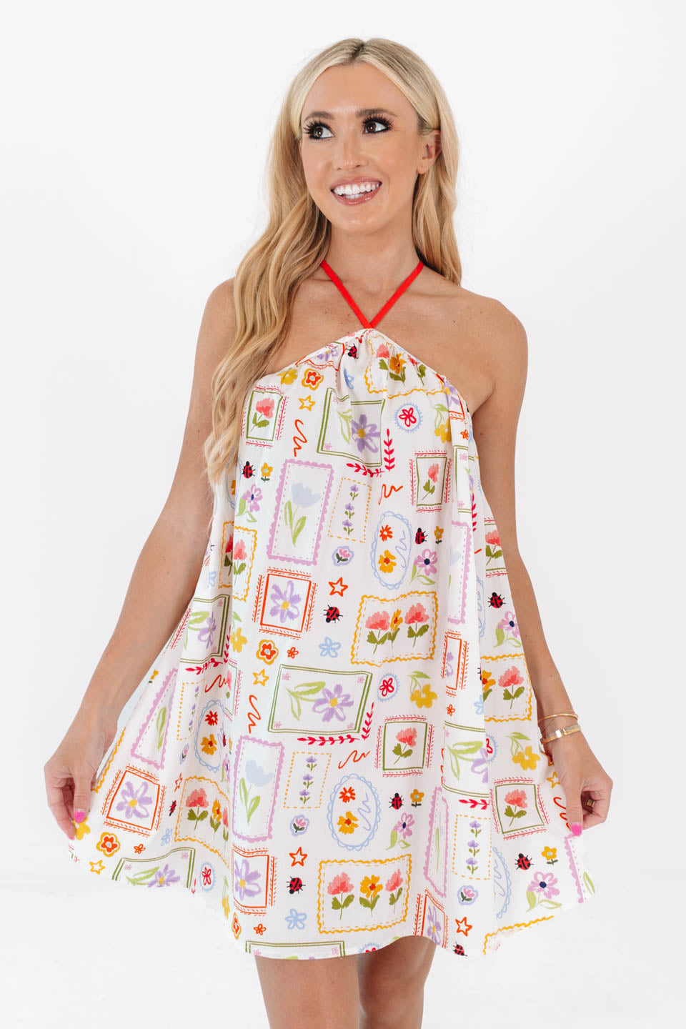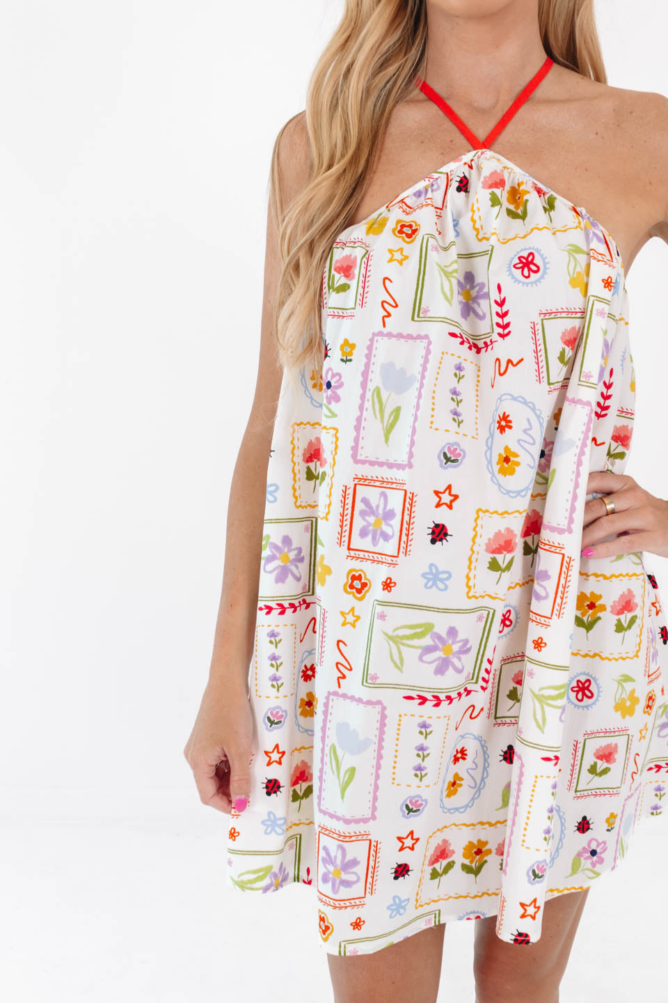 Say hello to sunshine days in this playful halter dress, covered in whimsical hand-drawn florals and patchwork-style prints. The flowy silhouette and vibrant red neckline tie add a flirty pop perfect for picnics, playdates, and everything in between. Made to twirl, smile, and soak up the joy!