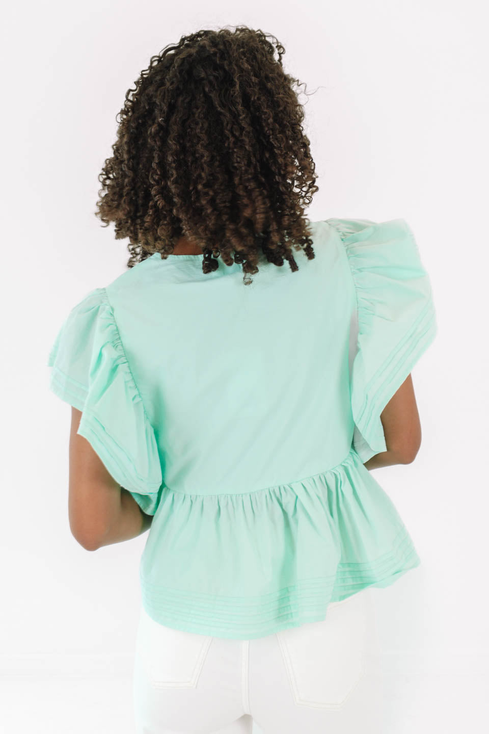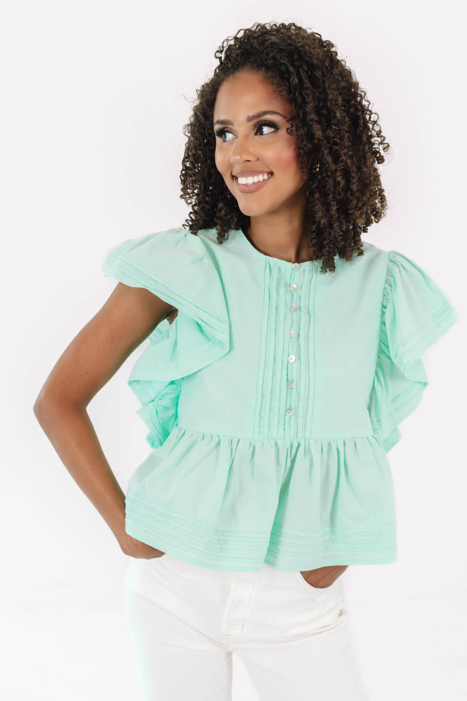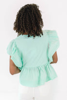 This minty-fresh top is your new go-to for sweet summer days and spontaneous brunch plans. With playful ruffle sleeves and delicate buttons, it adds just the right amount of charm to any outfit. Breezy, flirty, and effortlessly cute—this top is a breath of fresh style!