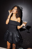 This off-the-shoulder mini dress is the ultimate mix of sleek and playful, with a fitted bodice that flows into a flirty, voluminous skirt. Its chic black hue makes it perfect for both cocktail parties and nights out where you want to turn heads. Pair it with sharp heels and gold accents for a look that’s effortlessly bold and fun!