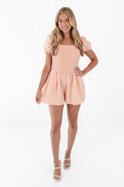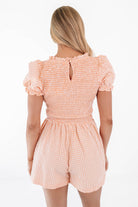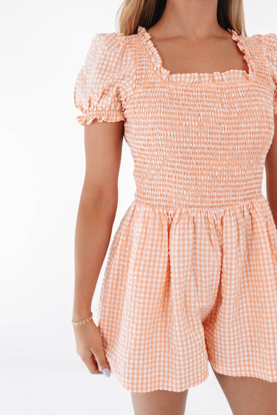 This orange gingham romper is a sweet slice of summertime joy! With its smocked bodice, puff sleeves, and playful fit, it’s made for twirling through picnics or brunch dates. Just add sunshine and your favorite sandals for instant cuteness overload.