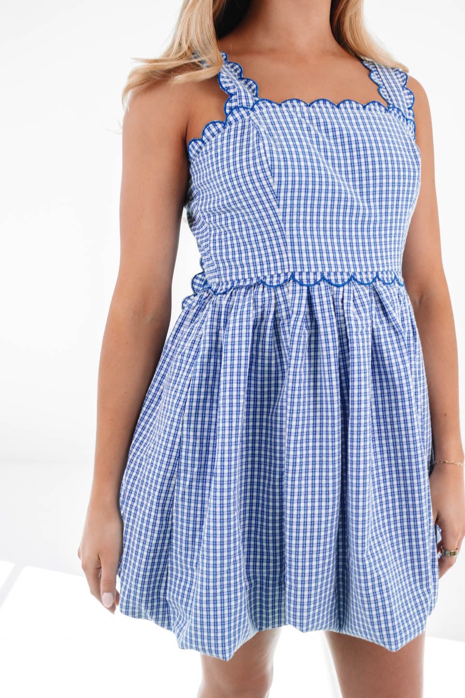 This gingham mini dress is giving major picnic-in-the-park vibes with its adorable scalloped trim and breezy silhouette! The classic blue and white checkered pattern adds a touch of vintage charm, while the playful straps make it perfect for twirling in the sunshine. Whether you're sipping lemonade or dancing under the stars, this dress is your new go-to for effortless summer fun!