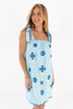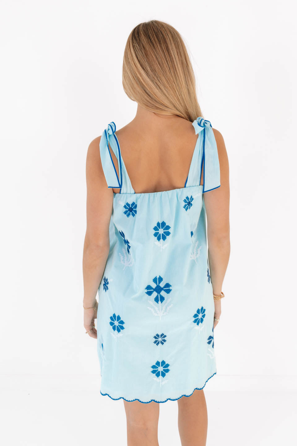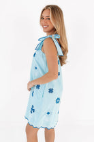 This breezy short blue dress is perfect for spring, featuring beautiful floral embroidery throughout for a fresh, feminine touch. With tie straps and a straight body, it offers a relaxed yet flattering fit, while the blue trim adds a playful detail. Light and airy, this dress is ideal for enjoying warm, sunny days in style!
