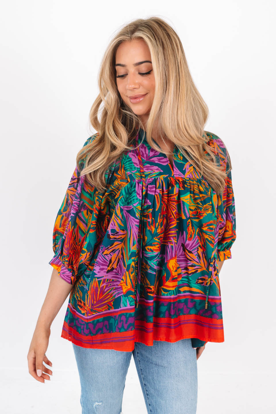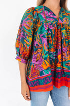 This fall patterned top showcases a vibrant botannical print, perfect for a fun outfit. The relaxed fit and three-quarter sleeves add a touch of casual sophistication, making it ideal for both casual outings and more polished events. Pair it with your favorite white pants or jeans for a breezy, stylish look.