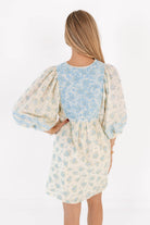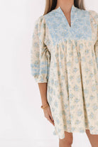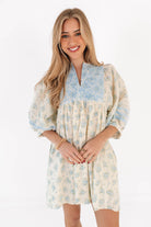 This elegant cream dress features a delicate blue floral print and beautiful blue embroidery for a feminine, refined look. The V-neckline and three-quarter sleeves add a touch of sophistication, while the flowy design ensures comfort and ease. Perfect for a casual day out or a dressier occasion, this dress combines grace and style effortlessly!