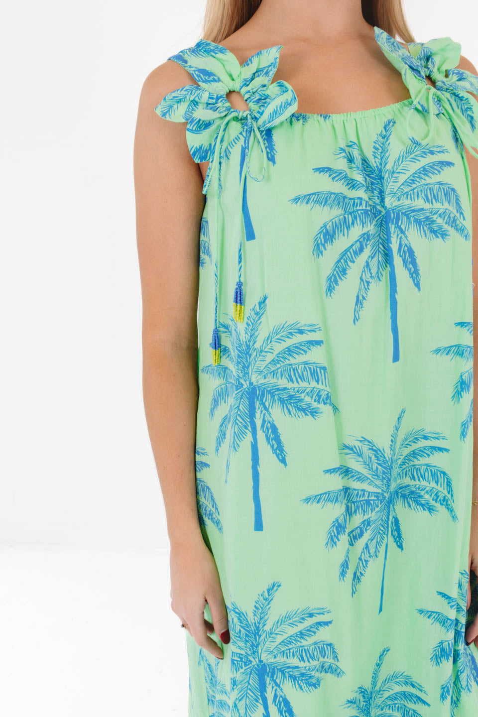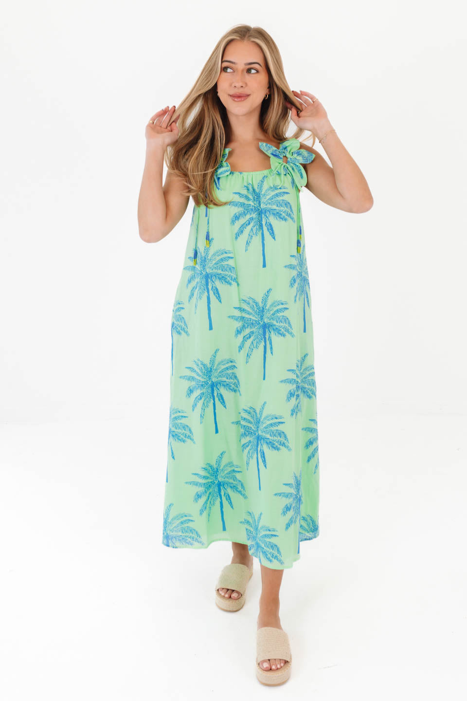 This playful midi dress features a tropical blue print, bringing a fresh and flirty feel to your wardrobe. With flower strap detail and beaded ties adds a playful touch. Perfect for a spring outing or special occasion, this dress combines style and comfort effortlessly!