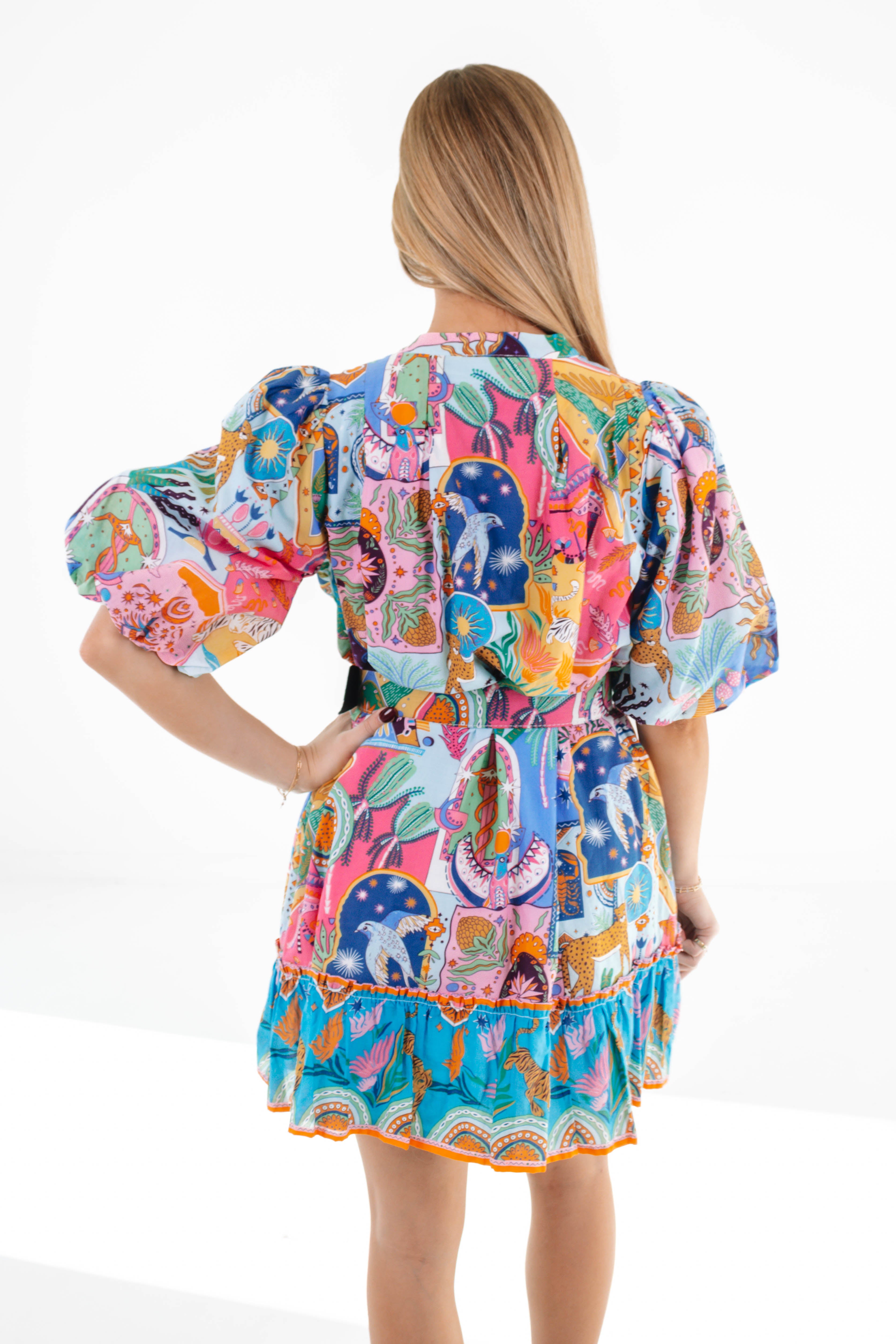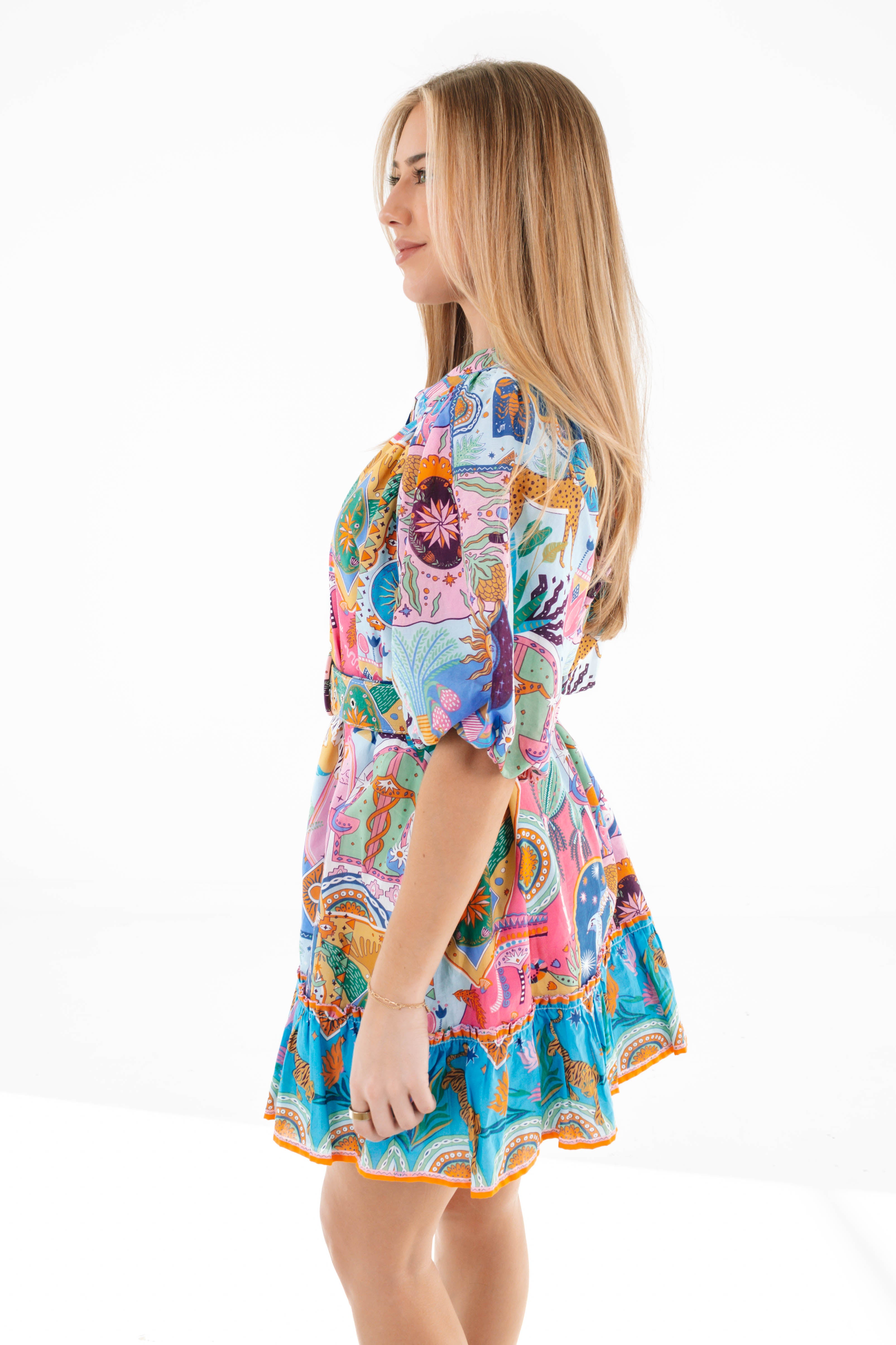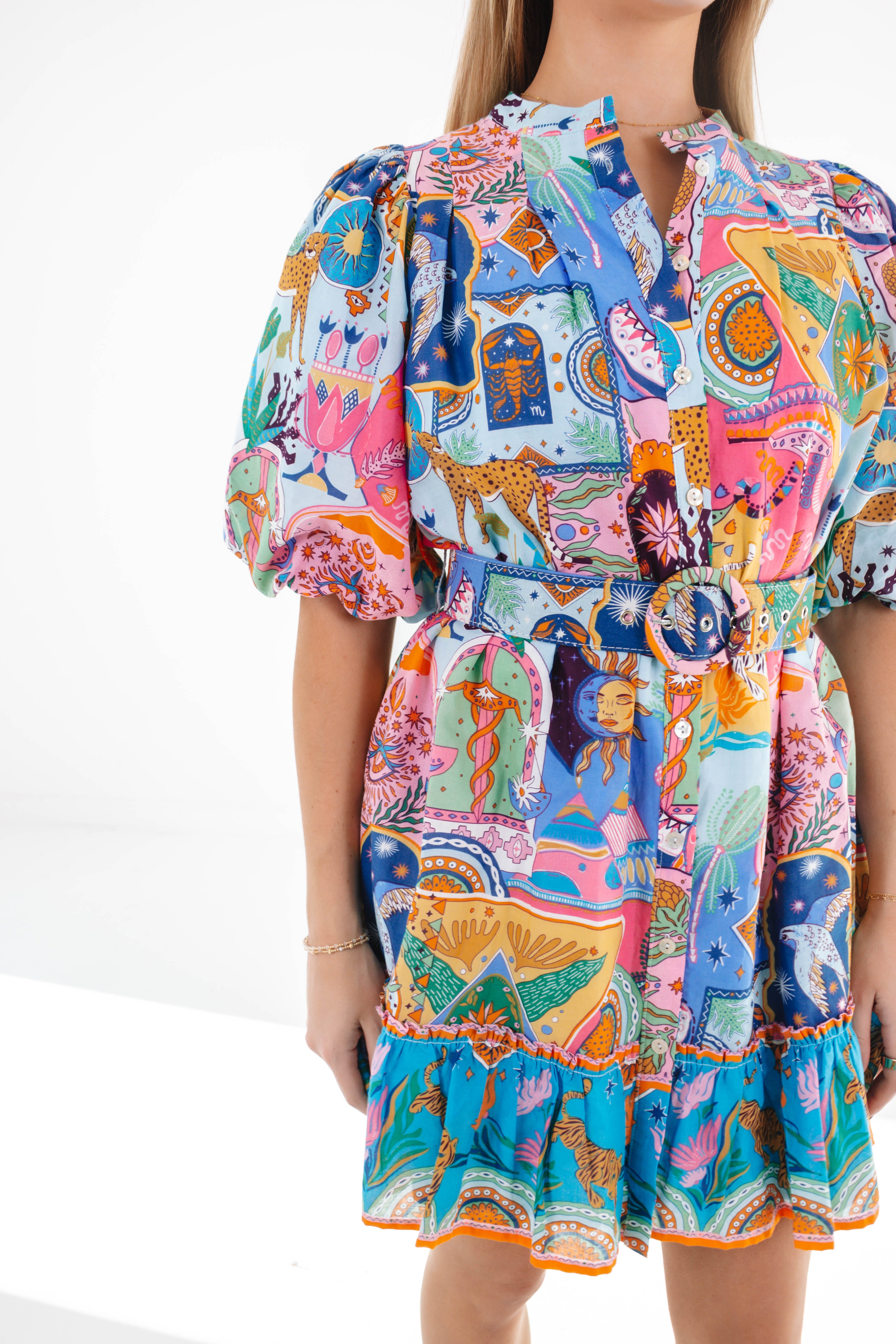 Step into summer with this belted mini dress, featuring bold bubble sleeves and a chic button-up neckline. The vibrant zodiac print in shades of blue and pink adds a dreamy, celestial touch. Effortlessly playful and polished, it’s perfect for warm-weather outings!