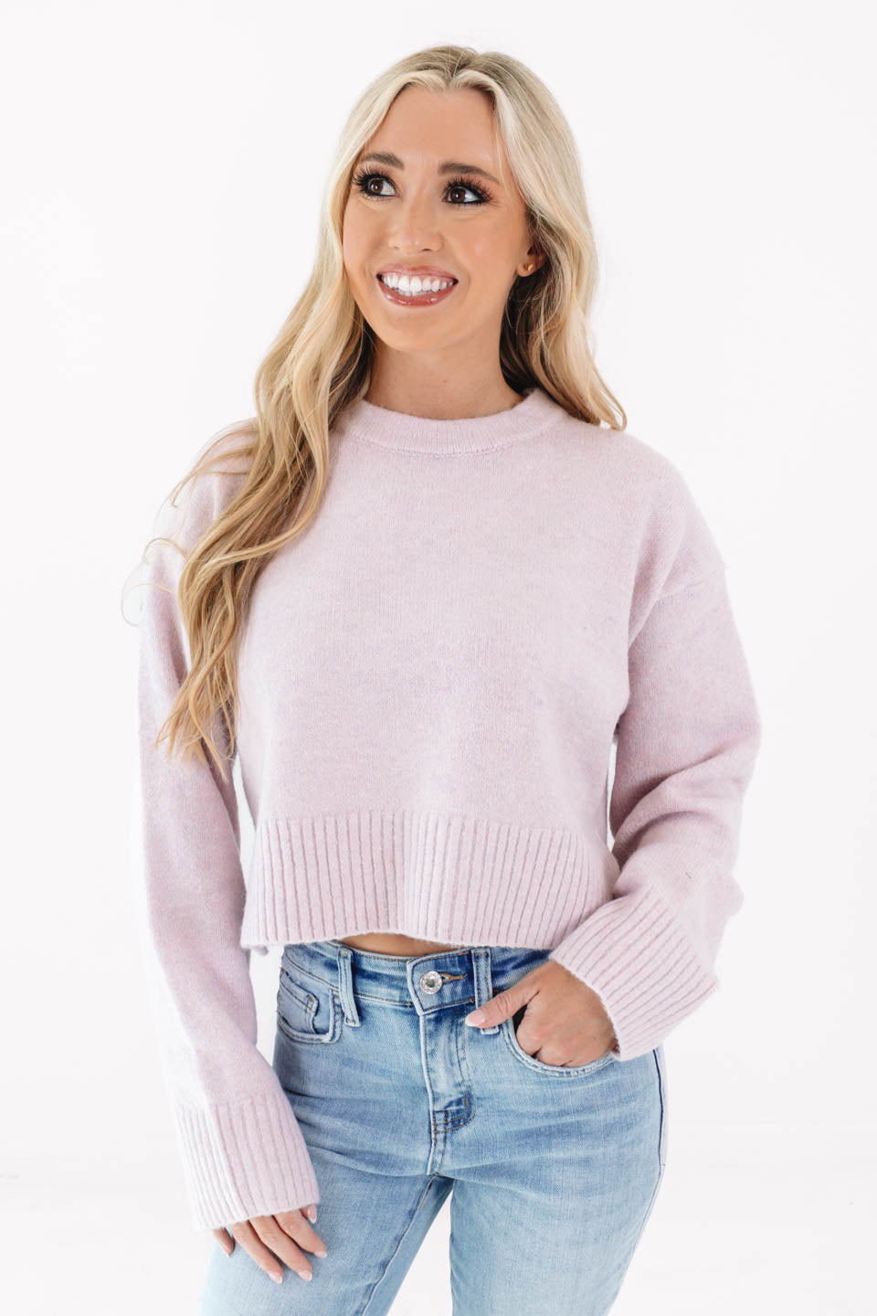 This soft blush pink sweater is sweet, chic, and just the right amount of cozy. With its cropped cut and ribbed hem, it’s perfect for pairing with high-waisted jeans or a flowy skirt. A dreamy blend of casual comfort and flirty fun, it’s the sweater you’ll reach for again and again!