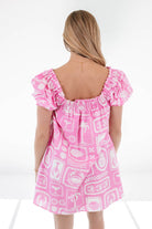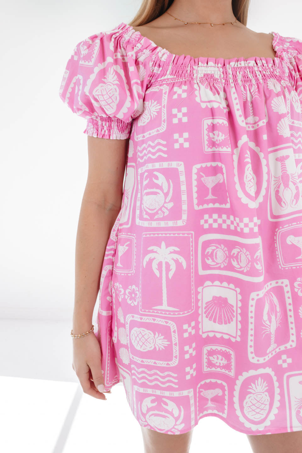 Tropical dreams come true in this playful mini dress, featuring a lively pink print straight out of a beachside getaway. The puff sleeves and square neckline add a touch of vintage flair, making it perfect for brunch or a stroll through paradise. Just add a fruity drink in hand, and you’re golden!